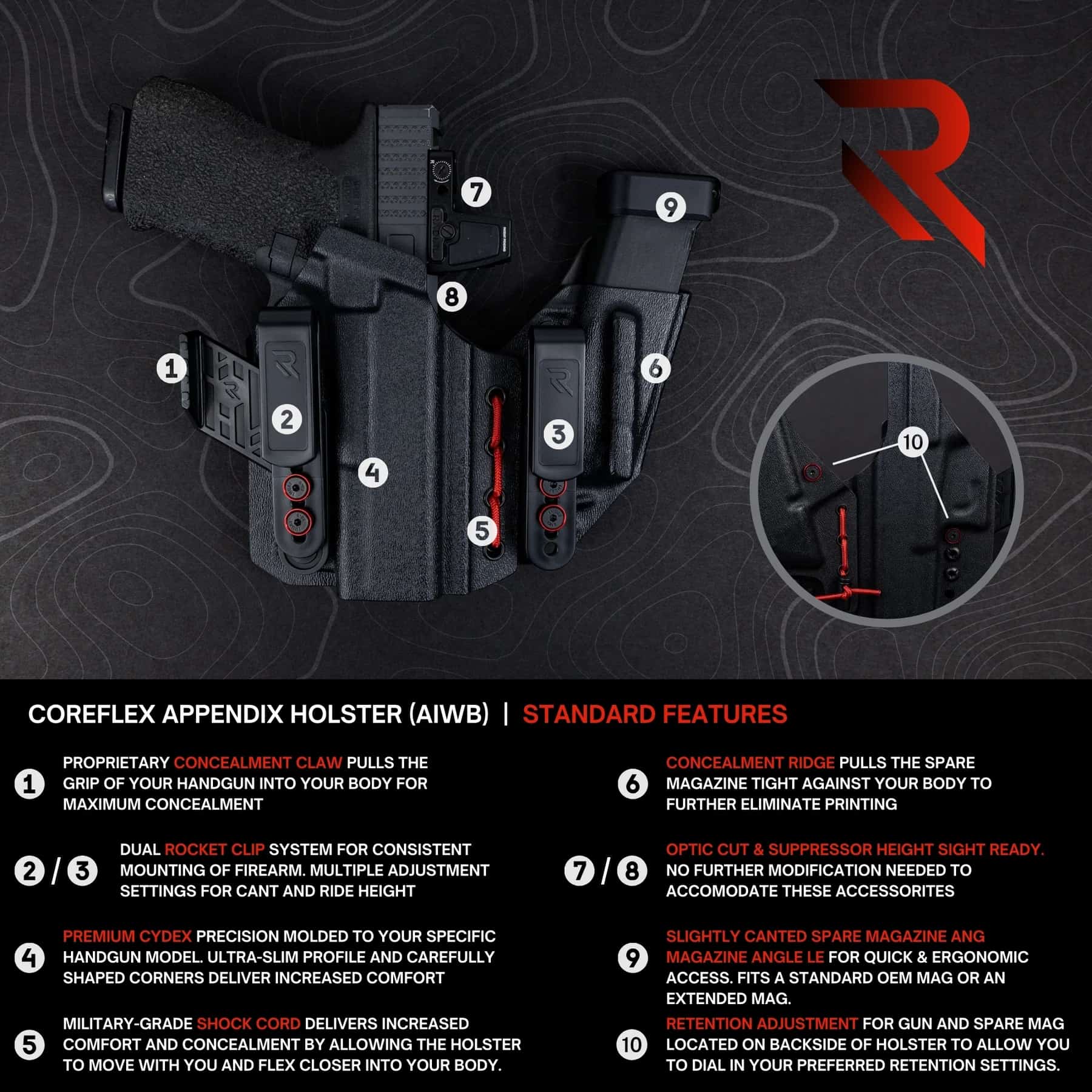 The Radial Coreflex Holster is built specifically for appendix carry (AIWB). We've carefully selected and tested each component to provide the maximum versatility, comfort, and concealment for the end user.